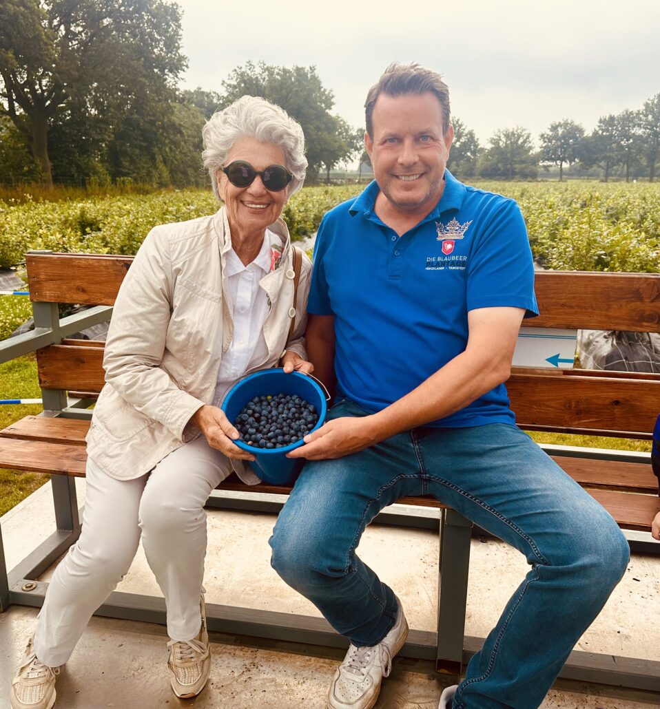 Nach der kleinen Ankunftspause machten wir uns auf den Weg zum Blaubeerfeld. Wir stiegen auf einen kleinen Traktor mit Anhängern, der uns gemütlich durch das Gelände direkt zum Blaubeerfeld brachte – wie herrlich das wackelt. Es erwarteten uns saftige, reife Beeren, die in großer Zahl an den Sträuchern hingen. Wir durften nach Herzenslust pflücken und auch naschen – mh, einfach lecker die süßen Früchte!